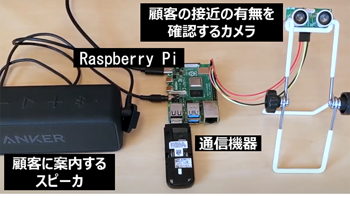 SORACOM IoT DIY レシピの一例:Raspberry Pi(シングルボードコンピュータ) *4 を使用した、近づくと自動応答する店番ロボットの試作例。顧客が近づくと音声で案内する。応答した実績をチャット等で共有する。レゴブロックのように機器を組み合わせて製作できる*4 手のひらサイズの、小さな1枚(シングル)のプリント基板(ボード)に、コンピュータとして必要な機能や要素を実装したもの