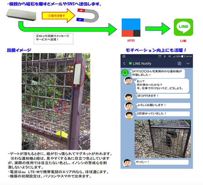 LINEに通知が届くIoT箱罠。鳥獣等の捕獲向けの導入例。箱罠のゲートが落ちると、自身のスマホ等に通知される(SORACOM IoT DIY レシピより)組織データ