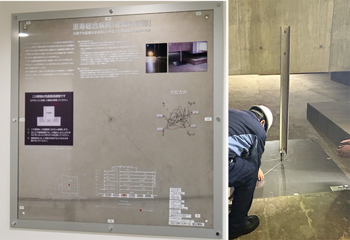 地下の免震層にある記録板「ケガキ板」には、40cmほどの地震で動いた跡(引っ掻き)が記録されていた。病院内の通路にはその記録が掲示されている組織データ