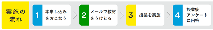 教員による教材使用の申し込みの流れ。教材は、メールで取得。授業後のアンケートへの回答が必要
