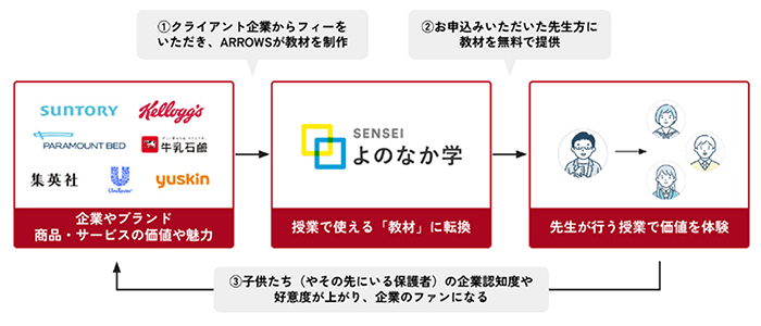 「先生方には授業をする上で困っている領域がある」という課題が見えてきた一方、企業の中には「自社技術や商品のこだわりを若年層やその保護者にもっと知ってもらい、ファンを増やしたい」というニーズがあることに気づき、学校授業で使う教材を介して両者をマッチングするサービスモデルを考案。企業側の予算で教材制作をするため、先生方は無料で教材を使用することが可能となり、子どもたちは学校授業で企業がもつ知見最新情報を学ぶことができる。教員・子ども・企業の三方良しとなる仕組みを構築している。