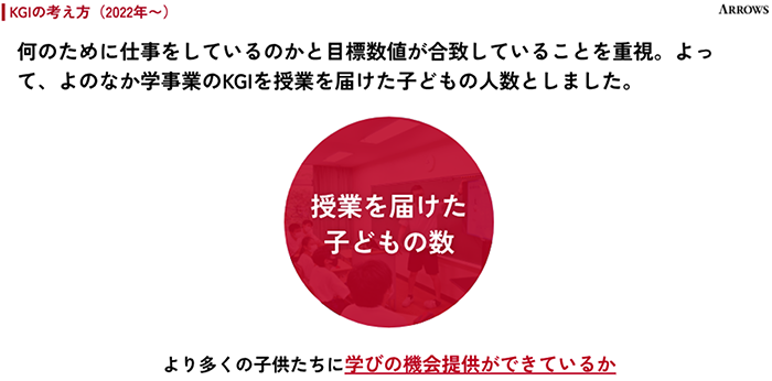 KGI(経営目標達成指標)とその達成に向けた構造モデル。KGIは、理念起点の目標である学びを届けた子どもの人数。売上は結果指標と捉える。2026年2月時点で、子どもの累計申込数は270万人を突破している組織データ