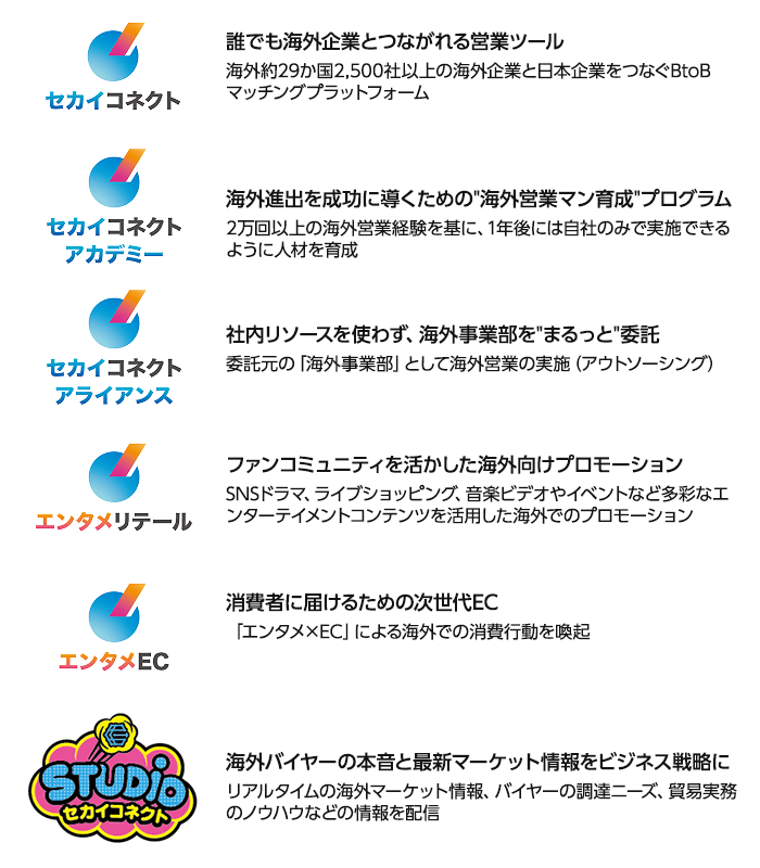 海外バイヤーの“欲しいもの”を提供する日本企業をつなぐマッチングサービス「セカイコネクト」により日本企業の提案・商談・商品輸出までをサポートする。加えて、ファンコミュニティでのプロモーションの実施(エンタメリテール)なども展開し、日本企業の海外進出全般をサポートする。販路開拓の先のリピート獲得までも視野に置く。