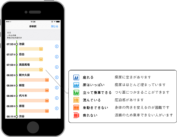電車の混雑情報の提供例。乗車する電車の混み具合をリアルタイムで確認できる