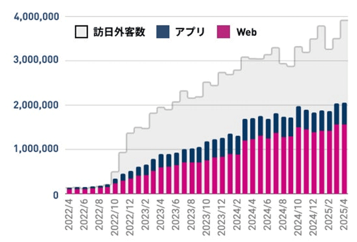 月間アクティブユーザー数の推移。ユーザーの内訳は、Webサイトが150万、アプリが50万(2025年4月現在)