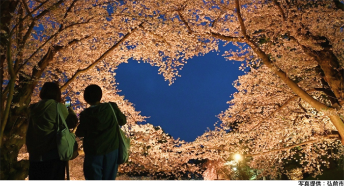 訪日観光客による桜の名所の紹介例(弘前公園、青森県弘前市)。『手前にある2本の夫婦の木から桜のハートが見えるんですね』と好評を博す