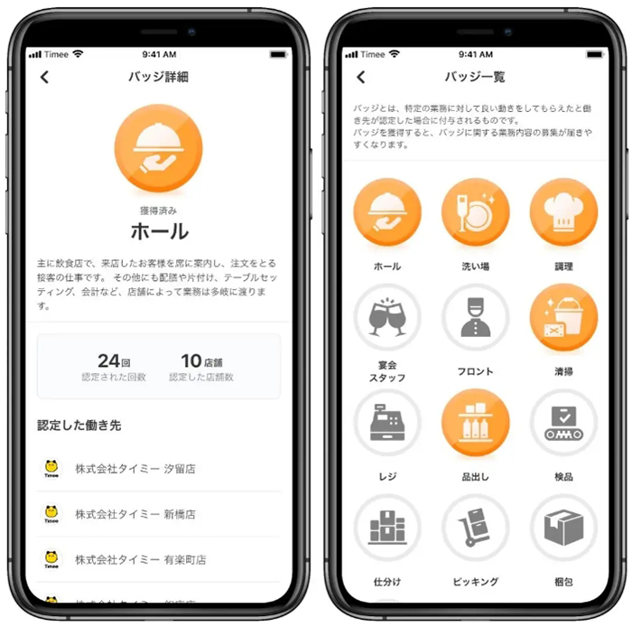 勤務後、雇用主は働きぶりをレビュー。評価を得られることで働き手は働きがいが得られる。2023年には特に優れた働き手に対してスキル毎に付与される「バッジ機能」をリリースし、働き手のスキルを可視化。バッジ保有者限定の募集により、雇用主は即戦力を確保でき、働き手はより高い時給の獲得につながる。