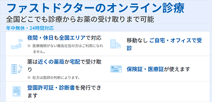 総合医療プラットフォーム「ファストドクター」を運営。夜間・休日の往診やオンライン診療等を提供する。ミッションは、「生活者の不安と医療者の負担をなくす」。
