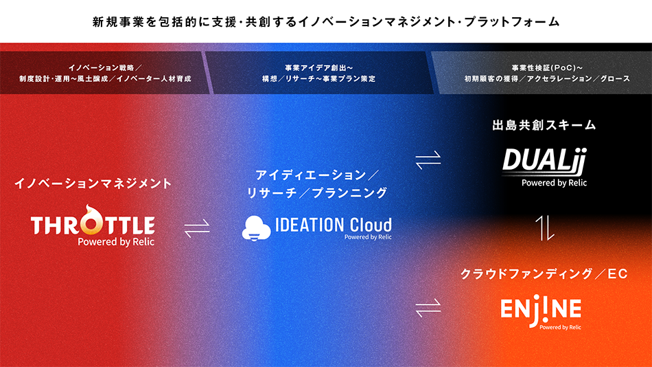 新規事業開発の各フェーズに対応した➊Throttle(スロットル)、➋IDEATION Cloud(アイディエーション・クラウド)、➌ENjiNE(エンジン)、➍DUALii(デュアリー)、これら4つのプラットフォームを活用し、新規事業開発の加速を支援する。個別利用も可能。
