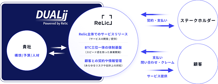 サービス名は、DUALii(デュアリー)。新規事業の仮説検証から商用化までに必要とされる事業運営・保守管理・顧客対応などの一連のプロセスを代行する。社内実施におけるリソース不足や投資リスク等のハードルを解消し、社会実装を加速。
