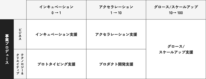 新規事業開発のプロセス全体を伴走支援するプラットフォーム群を用意。アイデア創出から事業化・成長までの各フェーズに対応するとともに、それらを包括的に一気通貫で支援するPlatform of Platformsを構築。新規事業開発に加えて、社内でのビジネスコンテスト、社内ベンチャー制度、オープンイノベーションプログラムにも対応する。