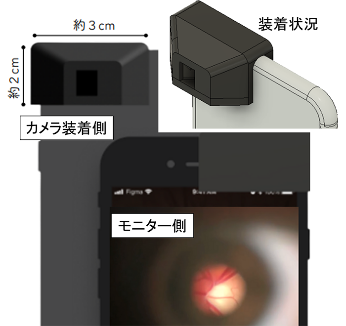 機器は、3Dプリンタで製造。軽量設計。機器をスマホのカメラ部分に装着して撮影するだけ。持ち運びも容易。移動診療でも活躍する。