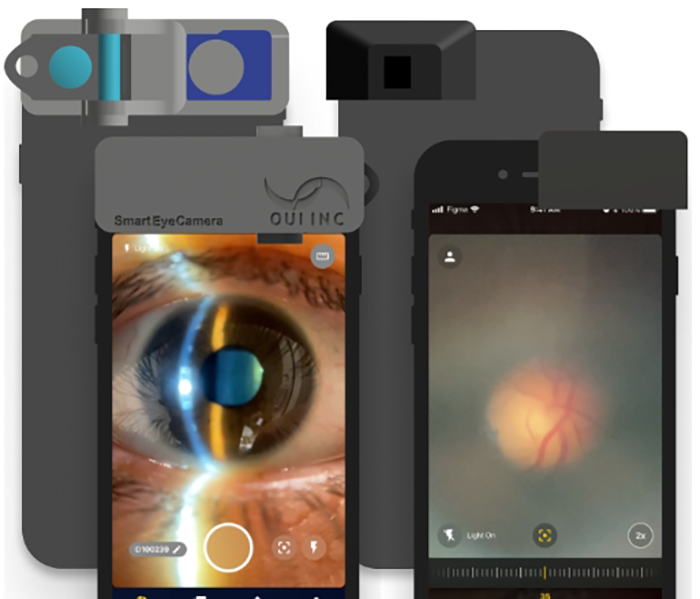 スマホ内蔵の小型カメラを使用し、眼底や前眼部を撮影し診断。白内障や緑内障等の診断に必要な高画質な画像が取得できる。装着する検査用機器の名称は、「Smart Eye Camera」。